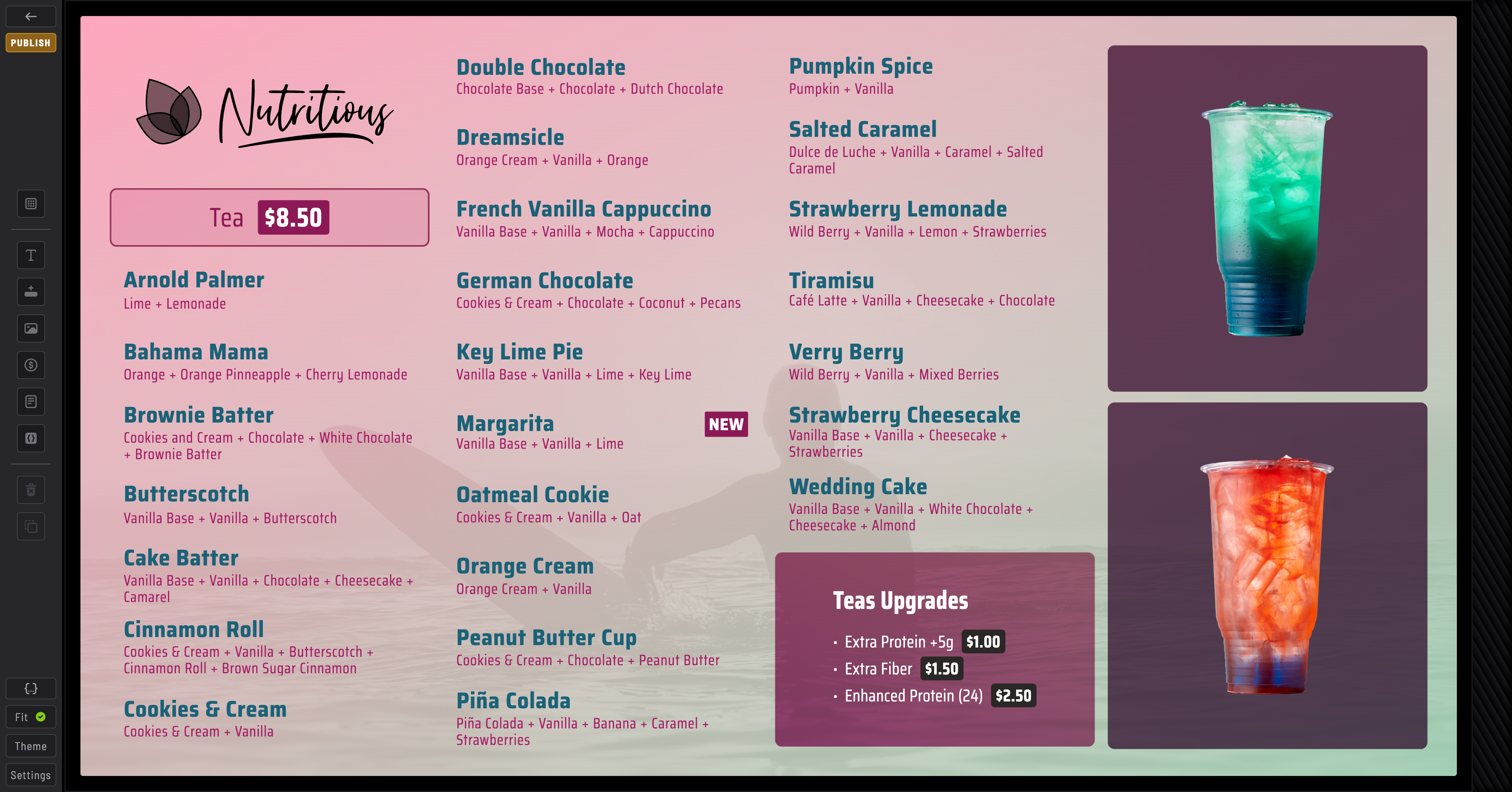 Create a beautiful menu in seconds by choosing one of our many unique themes. Make yourself a "White Chocolate Raz" shake and call it done. But a theme is also your starting point if you want to create something a little more unique.